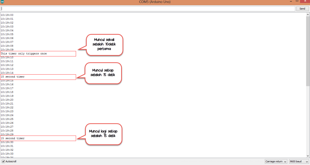 Hasilnya dapat dilihat di serial monitor yang akan menampilkan waktu pada setiap detiknya.