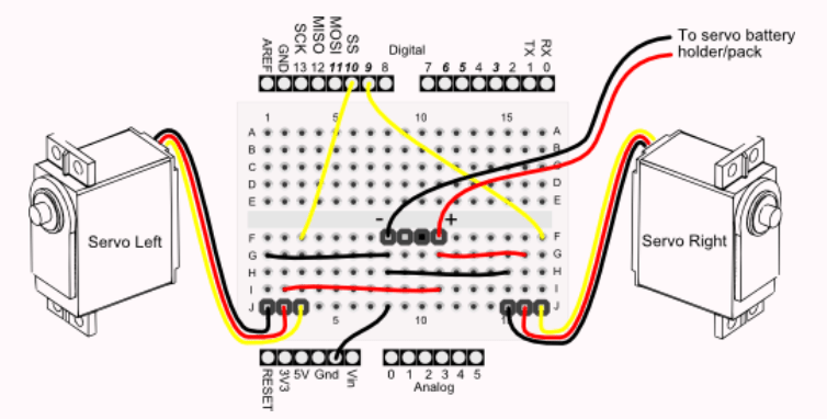 Merah :Penghubung motor servo ke tegangan 5V pada board Arduino. Fungsinya untuk memberikan power untuk motor servonya
