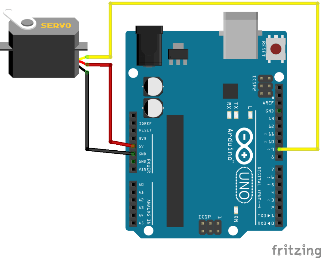 Motor servo punya 3 penghubung ke Arduino. Biasanya, dibedakan dengan warna kabelnya, yaitu merah, cokelat/hitam, dan kuning.